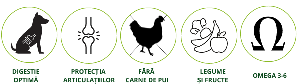 Ingrediente: Carne si derivate de origine animala (faina de carne de peste 26%, seu de vita 9.5%), porumb, grau, tarate, orez, mar, morcov, glucozamina condroitina, F.O.S., extract de Yucca Schidigera