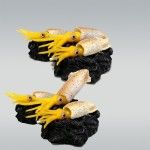 Ornament pentru acvarii: 3 calmari pe o baza de roca.